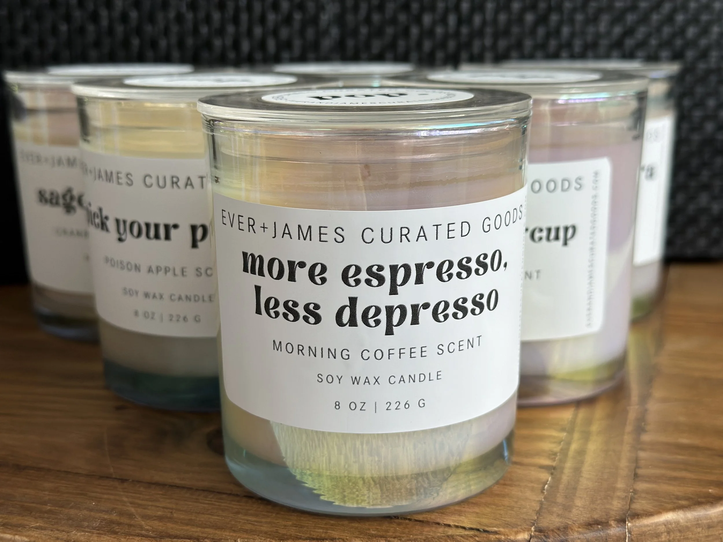 Express yourself with this aesthetic candle that also serves as a statement piece in your decor. The stout highball iridescent glass jar is bound to turn heads with every use.